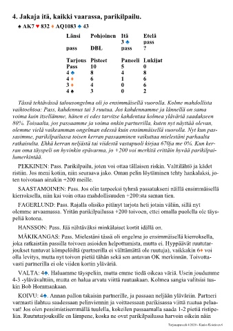 KOIVU: 4♣. Annan pallon takaisin partnerille, ja passaan neljään yläväriin. Partneri